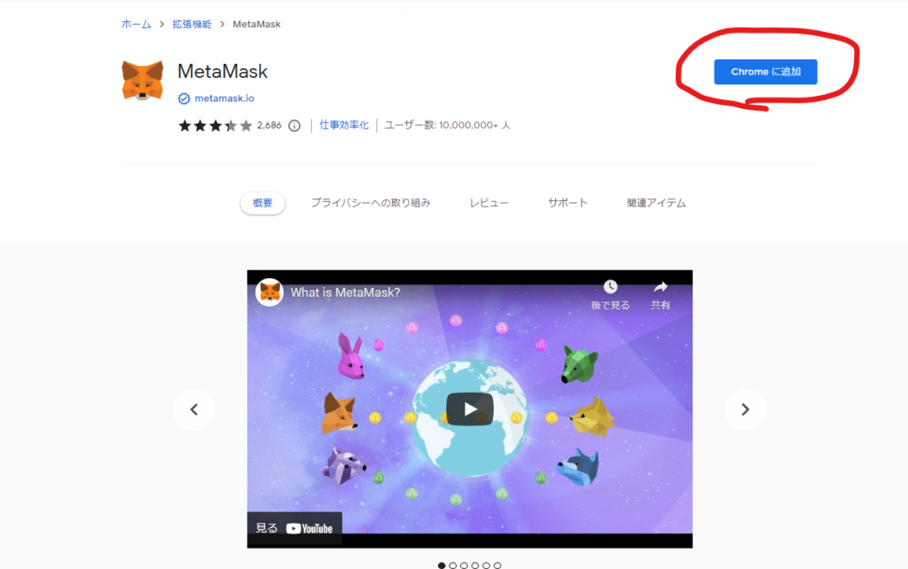 ChromeのウェブストアからMetaMaskをインストールします。