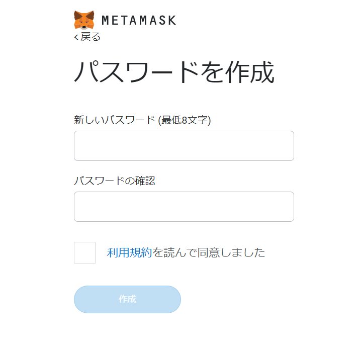 MetaMask はすぐに簡単に匿名で利用開始できます。メールアドレスも必要ありません。パスワードを設定し、秘密の復元フレーズを設定(忘れたらだめ)するだけで完了です。