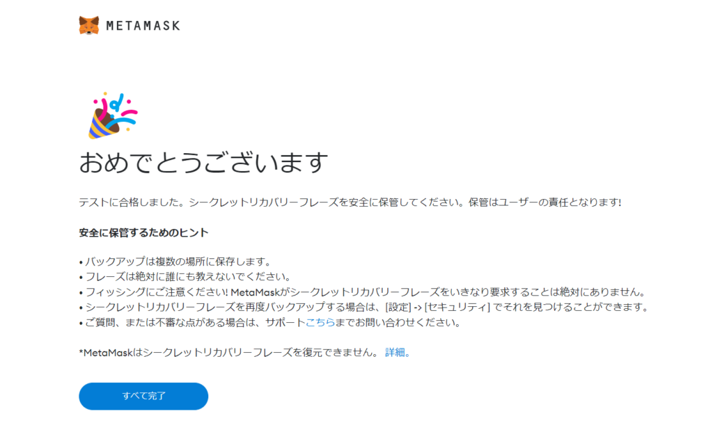 リカバリーフレーズの確認テストが完了するとこのような画面が表示されます。