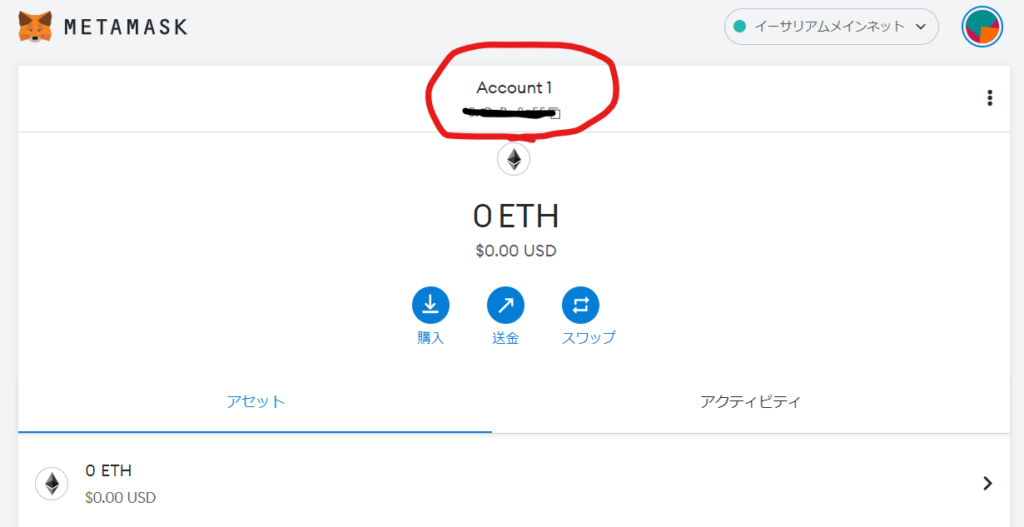 ウォレットに暗号通貨を入金するには、画面中央上部にあるアカウント名の部分をのテキストをコピーします。